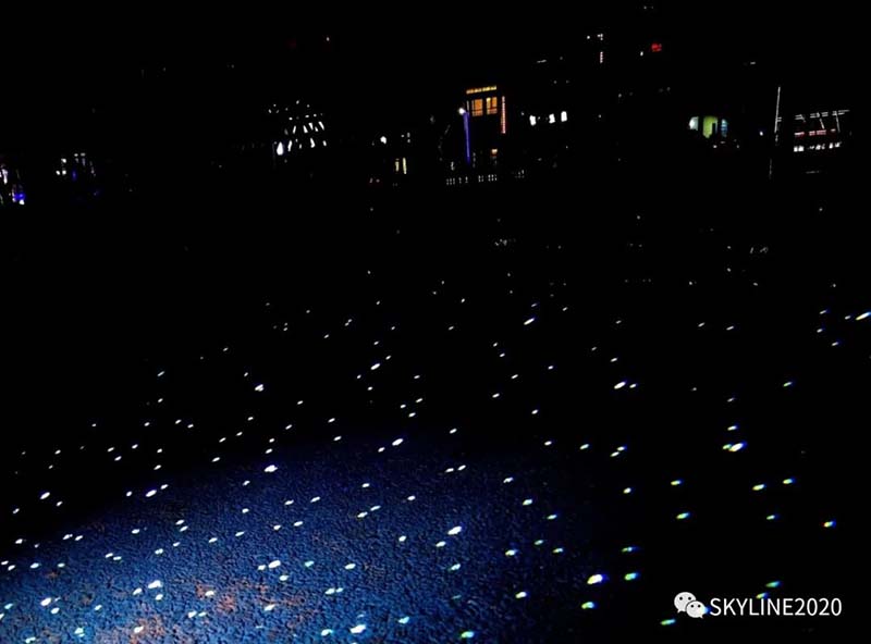 地上的繁星:充满艺术感的路灯,在地上铺满了繁星,远处的霓虹灯光,轻轻拂过这片柔波,忽而升,降,腾,挪。